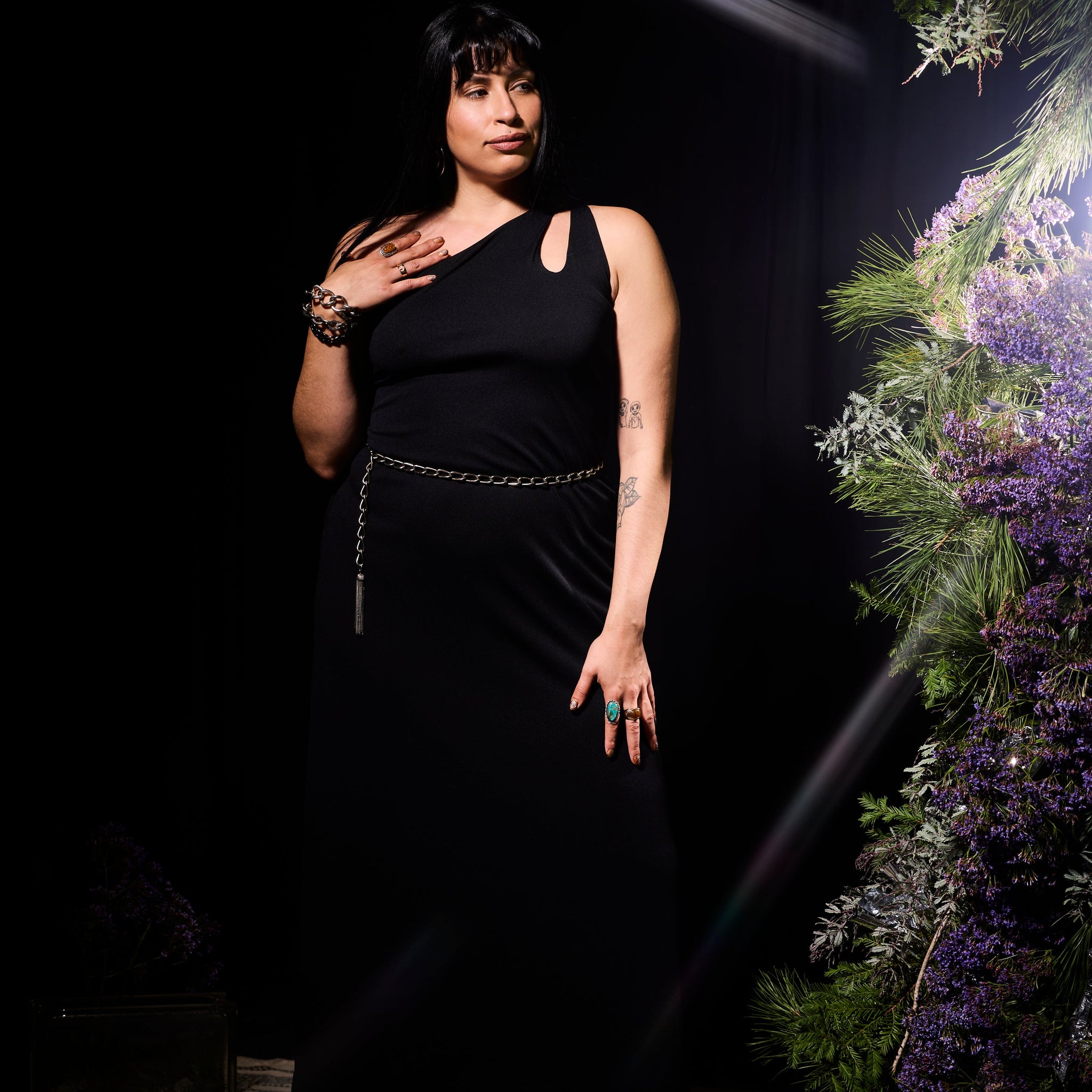 One shoulder dress by Leslie Fay circa 1970's. Beautiful A-line silhouette with cutout at the shoulder. Side zipper closure, fabric has stretch. This dress is classic elegance.